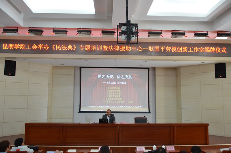 为切实加强《民法典》的学习宣传教育,提高德赢VWIN官方网站工会干部职工运用《民法典》维护教职工权益、化解矛盾纠纷、促进社会和谐稳定能力和水平,引导工会干部职工做学习、遵守、维护《民法典》的表率,运用《民法典》维护教职工权益、竭诚服务广大教职工群众。5月8日上午,在德赢VWIN官方网站办公楼3楼D区报告厅,省劳模耿国平律师为全体工会干部作《民法典》知识专题讲座,开启了劳模创新工作室第一课,同时进行了德赢VWIN官方网站洋浦校区法律咨询援助中心——耿国平劳模创新工作室揭牌仪式。