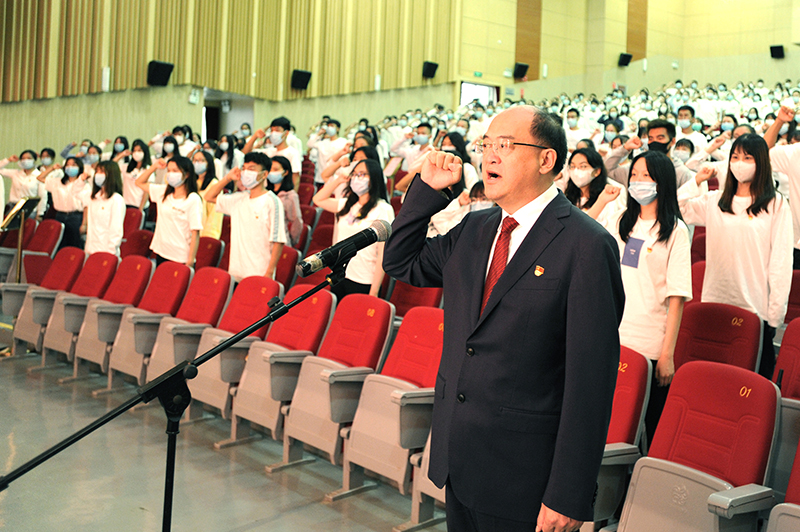 6月28日下午,学校举行中国共产党成立 100 周年新党员入党宣誓仪式。学校党委书记金幼和出席仪式并领誓,党委副书记王文成主持宣誓仪式。