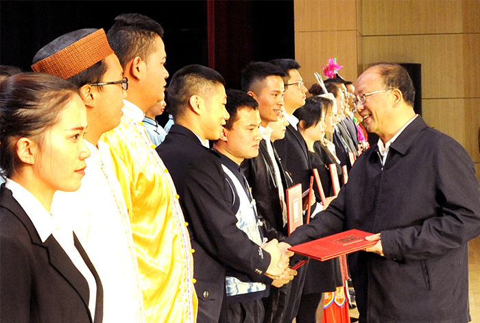 9月29日下午,云南省高校“新时代、新担当、新作为”主题活动在德赢官网学生会堂举行。 省委常委,省委组织部部长,云南省大学生思想政治教育工作领导小组组长李小三出席活动并为年度人物获奖代表颁奖。 主题活动由主题班会展示、故事演讲、优秀人物颁奖等部分组成。云南师范大学辅导员赵德虎现场展示了一堂关于《学习党的十九大 争做时代新青年》的主题班会,通过“知•情•意•行”四个阶段,将党的十九大精神融入到学生头脑之中。全国高校辅导员年度人物、云南大学辅导员朱丹分享了自己担任辅导员6年来的成长历程,号召辅导员成为习近平总书记今年教师节寄语的塑造学生品格、品行、品味的“大先生”。云南大学学生傅靖涵讲述了云南大学研究生支教团的故事,充分展示了新时代青年乘新时代春风,在祖国的万里长空放飞青春梦想的风貌。整场活动寓意深厚、感人至深,引领广大师生爱国、励志、求真、力行。 主题活动对2018年云南省大学生年度人物、高校辅导员年度人物、最受学生敬佩辅导员、最关爱学生班主任进行表彰。省委常委,省委组织部部长,云南省大学生思想政治教育工作领导小组组长李小三出席活动并为云南省第十届高校辅导员年度人物和第十三届大学年度人物获奖代表颁奖。云南省人民政府教学督导团总督学陈世波为云南省高校第四届最受学生敬佩辅导员和第三届最关爱学生班主任获奖代表颁奖。 活动最后,德赢官网全体辅导员齐唱《辅导员之歌》,唱响育人的路上高举理想,用爱与智慧为青春导航。