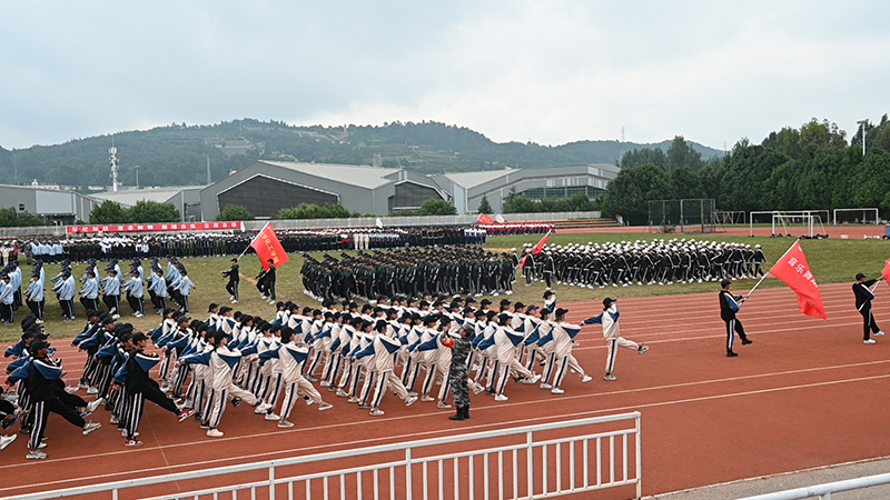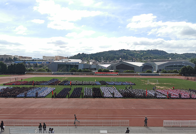 军训汇报表演在庄严的《义勇军进行曲》歌声中拉开序幕。2021级参训学生在田径场接受检阅。18个二级学院方队,口号嘹亮、脚步有力,依次走过主席台前,接受各位与会领导的检阅,展示14天军训的成果。