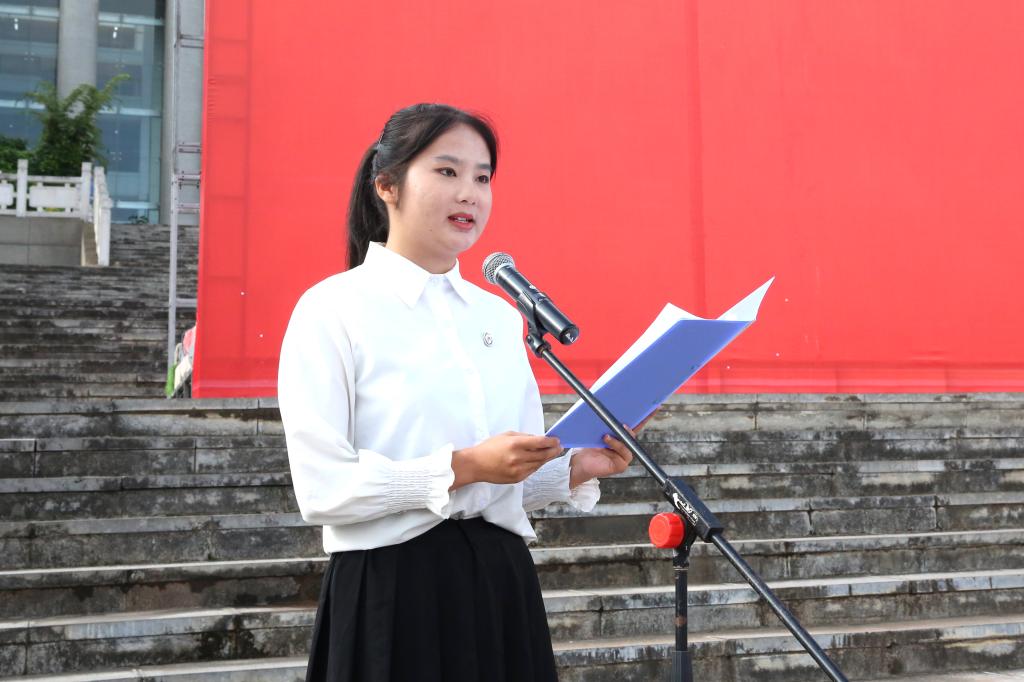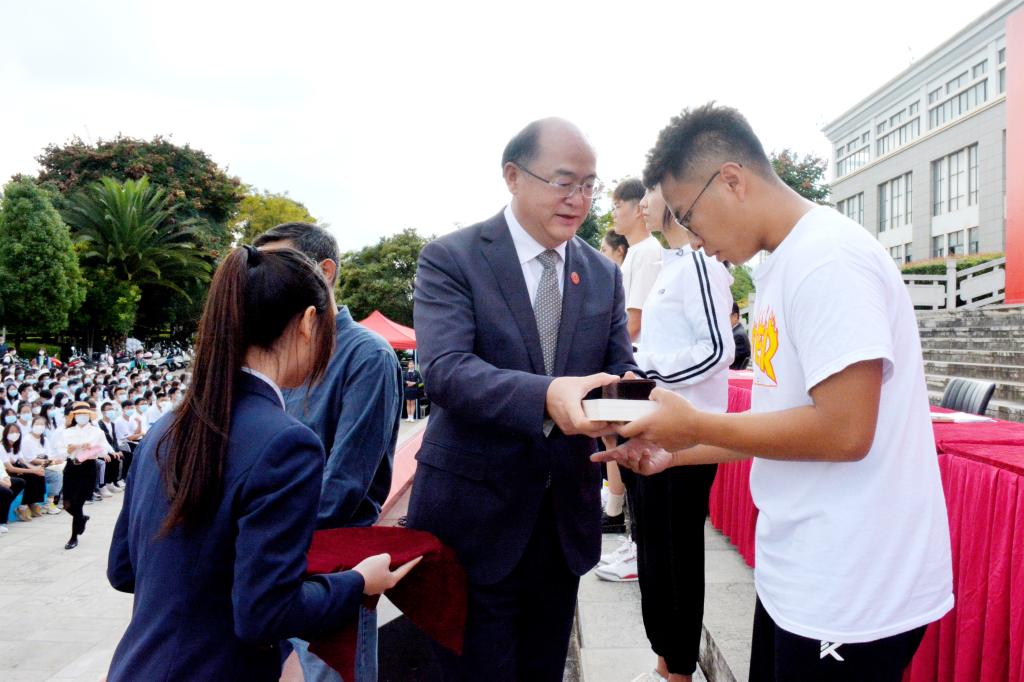 金幼和向新生代表赠送《习近平谈治国理政》第四卷并颁发校徽,希望同学们传承“聂耳精神”,赓续红色血脉,不负党和人民的殷切期望,牢记习近平总书记的殷切嘱托,凝聚起踔厉奋发、勇毅前进的青春力量,在民族复兴的壮阔征程上,争当伟大理想的追梦人,争做伟大事业的生力军。