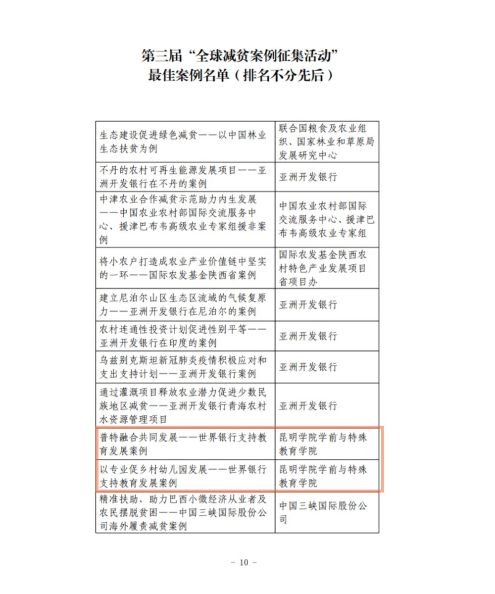 近日,由中国国际扶贫中心、国际农业发展基金、联合国粮食及农业组织、联合国世界粮食计划署和中国互联网新闻中心主办的“2022全球减贫伙伴研讨会”召开,会议发布了“第三届全球减贫案例征集活动”获奖案例。此次征集活动共收到减贫案例517个,获奖104个,云南省入选获奖案例3个。德赢官网学前与特殊教育学院申报的两个案例《普特融合共同发展--世界银行支持教育发展案例》、《以专业促乡村幼儿园发展--世界银行支持教育发展案例》获评为最佳案例。