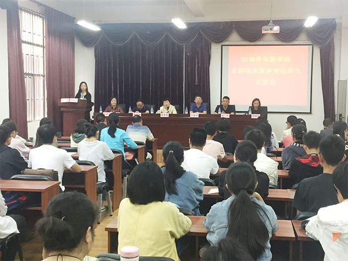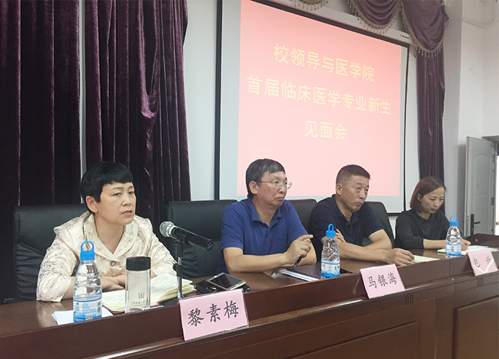 9月4日,黎素梅校长,马银海副校长,教务处、学生处、招生就业处包兴处长、校办等部门负责人到医学院参加德赢VWIN官方网站首届临床医学专业新生见面会。医学院班子成员、教研室主任、班主任、部分教师代表和临床医学专业全体44名新生参加了见面会。见面会由医学院院长余珊主持。