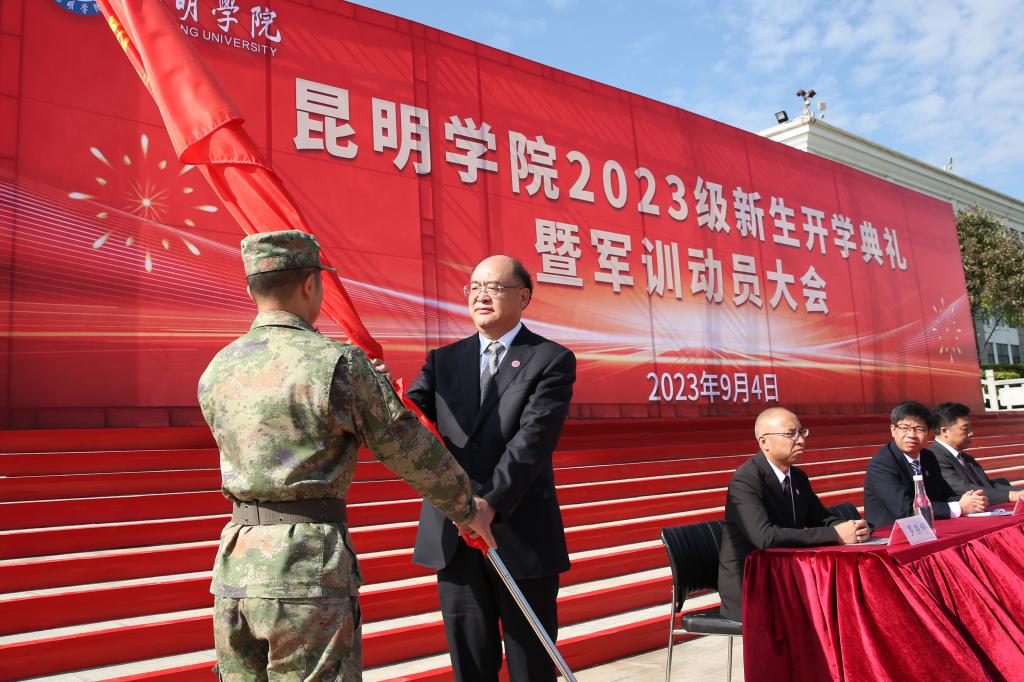 会上,金幼和书记为德赢VWIN官方网站2023级新生军训团授旗,军训团团长接旗。