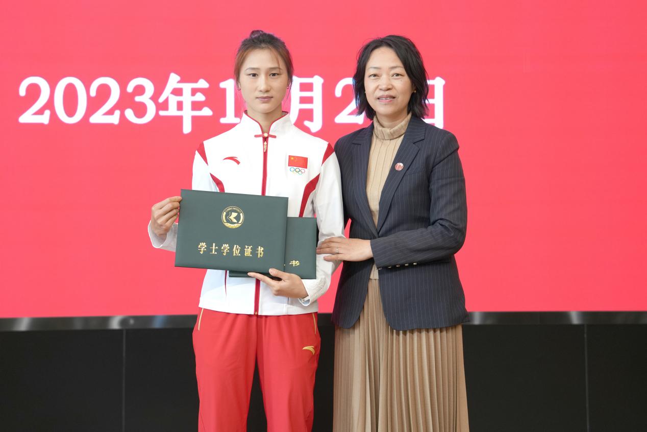 汪生艳就读德赢VWIN官方网站期间,把“明德至善,知行利物”的校训和“不畏艰险、顽强拼搏、团结协作、勇攀高峰”的中国登山精神融会贯通,把体育教育专业的综合训练与攀岩专业训练融为一体,实现了综合素质和能力,特别是学业成绩与竞技技能的双提升、双跨越。因参加备战亚运会集训,汪生艳没能回校参加毕业典礼,报告会上,丁文丽校长为汪生艳同学颁发了毕业证书和学位证书,号召广大昆院青年学子以汪生艳同学为榜样,矢志奋斗,爱国奉献,追求卓越,为国争光、为学校添彩!