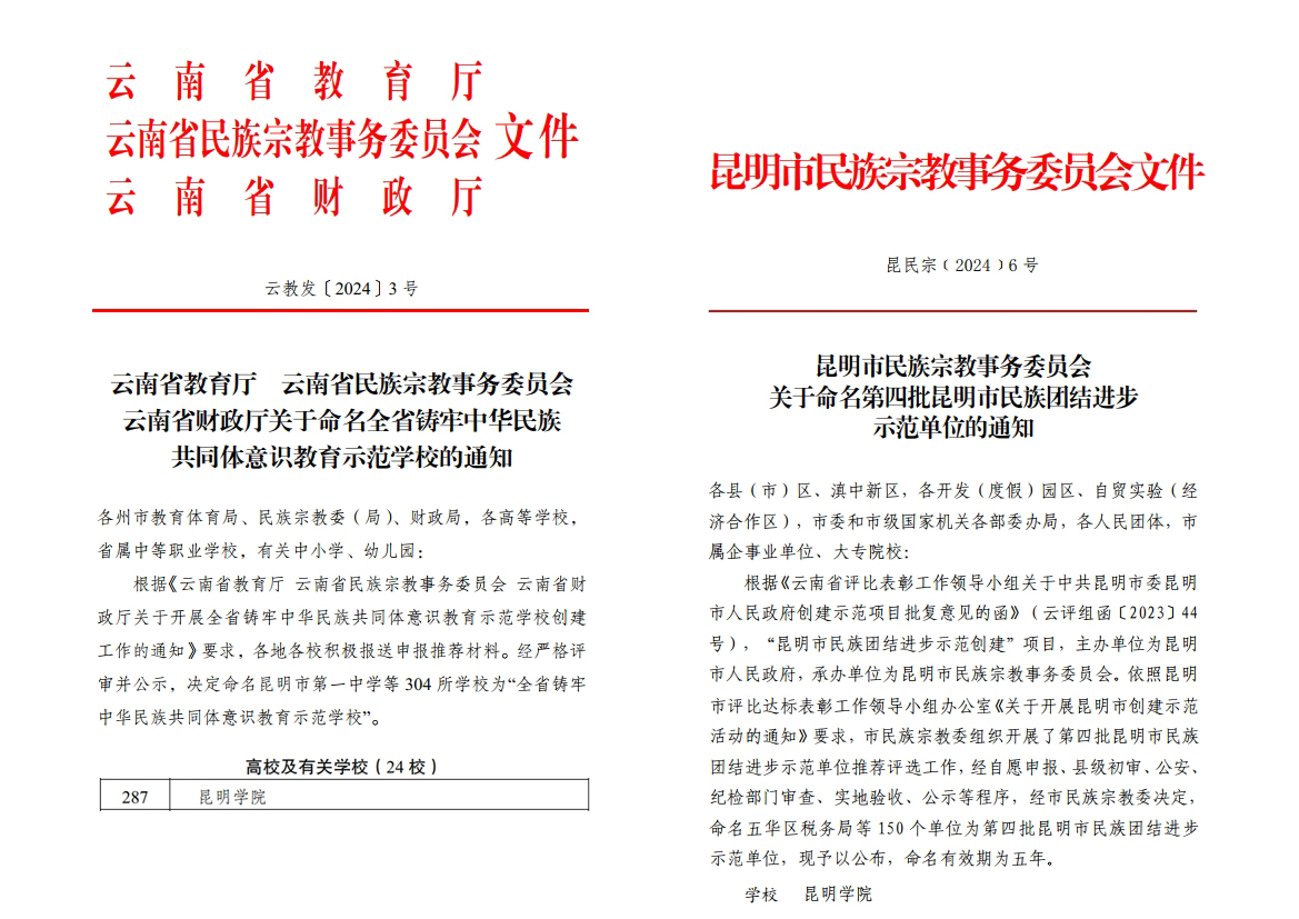 近日,云南省教育厅、云南省民族宗教事务委员会、云南省财政厅印发《关于命名全省铸牢中华民族共同体意识教育示范学校的通知》,昆明市民族宗教事务委员会印发《关于命名第四批昆明市民族团结进步示范单位的通知》,德赢官网均榜上有名,获评为“全省铸牢中华民族共同体意识教育示范学校”“第四批昆明市民族团结进步示范单位”。