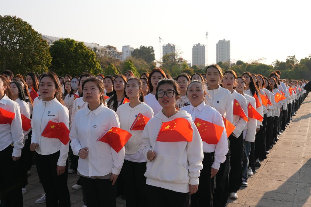 朝阳初升,师生们共聚聂耳广场。国旗班的同学们精神抖擞,迈着整齐划一的步伐走向升旗台。在高声齐唱的国歌声中,五星红旗冉冉升起,迎风飘扬,全场肃立,向五星红旗行注目礼。