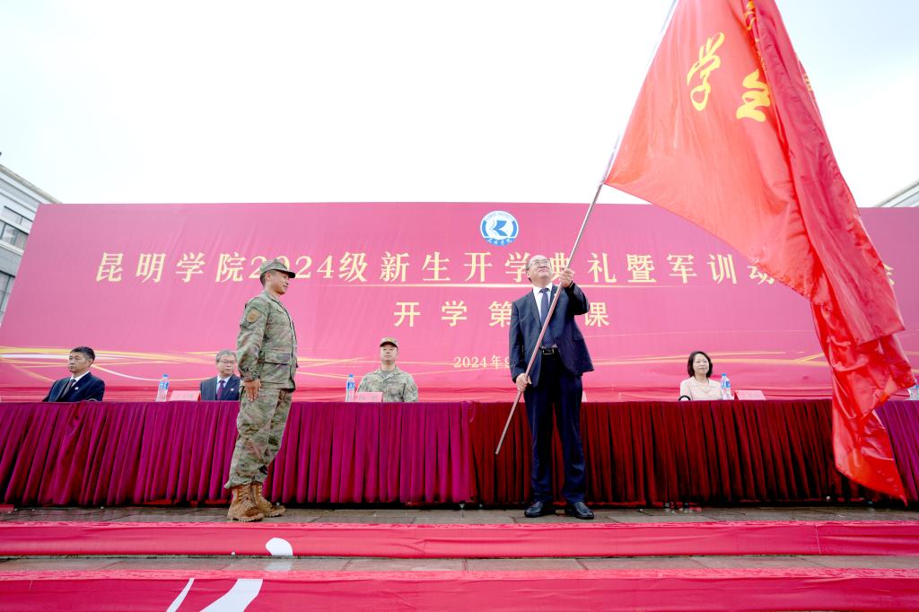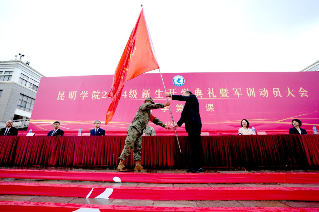 会上,金幼和为德赢VWIN官方网站2024级新生军训团授旗,军训团团长接旗。
