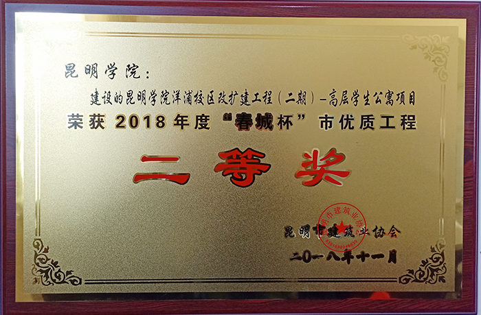 昆明市建设工程“春城杯奖”,是昆明市工程质量的最高荣誉奖。2018年3月根据《昆明市建筑工程“春城杯奖”(市优质工程)评选办法》要求,德赢官网将该项目进行了申报。经过初审及复审,最终荣获2018年度“春城杯”市优质工程二等奖。
