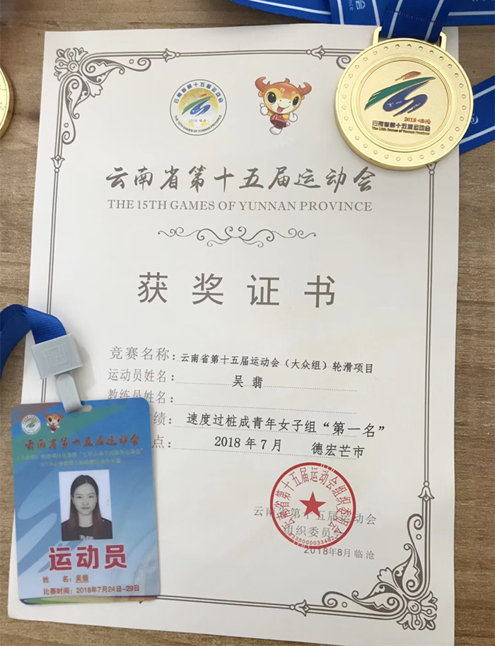 本次赛事是云南省运动会首次将轮滑项目纳入比赛。德赢VWIN官方网站近年来积极打造多维校园体育文化,在学校的大力支持下,体育学院通过不断开展轮滑培训、比赛、组建轮滑队等工作,培养了一批精英队伍。吴翡同学在云南省运动会上不负众望,勇夺金牌,奠定了德赢官网女子轮滑项目在全省的领先地位,为学校赢得了荣誉。