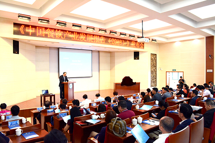 普洱学院于干千教授在会上发布《中国餐饮产业发展报告(2018)》。于教授从“回顾2017年中国餐饮产业运行的总体情况”、“总结在新时代中国餐饮发展的六个基本特征”、“展望中国餐饮产业在未来发展中面临的消费升级、素质经济、开放共享、绿色生态四个新的发展趋势给我们带来的机遇和挑战”作了阐述。