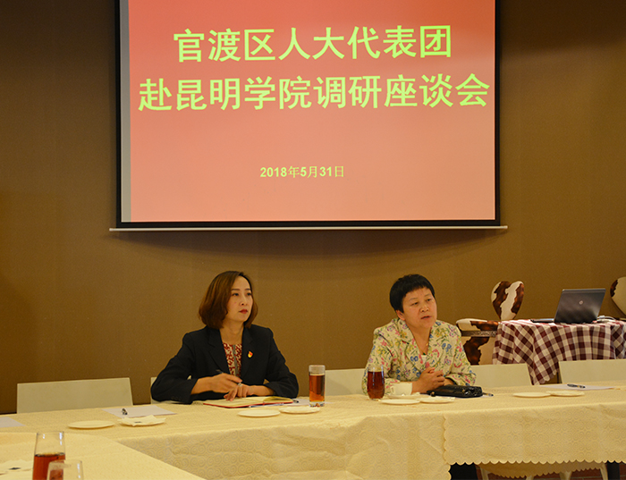 5月31日,昆明市人大常委会副主任毕惠芝,官渡区人大常委会主任刘利升一行到学校调研指导工作。校长黎素梅和校办、宣传部等部门负责人参加调研。 黎素梅校长就校园建设、办学定位、学科建设、人才培养、招生就业和服务地方经济等情况向毕副主任做了介绍,并对昆明市、官渡区人大代表们长期以来对学校工作的关心和支持表示感谢。