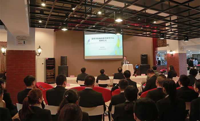 3月22日,德赢VWIN官方网站咖啡教学研究中心正式在旅游学院挂牌成立。省台办巡视员周友亮、台湾岚山咖啡有限公司董事长游启明、普洱爱伲庄园咖啡有限公司总经理陆洁、学校党委书记陈永明出席揭牌仪式,并为“德赢VWIN官方网站咖啡教学研究中心”揭牌。 陈永明书记致辞指出,旅游学院与台湾岚山咖啡有限公司和普洱爱伲庄园咖啡有限公司共建的咖啡教学研究中心,将是德赢VWIN官方网站应用型转型发展阶段深度校企合作的典范,中心的成立有助于高层次人才培养、有助于咖啡文化的传播、有助于服务地方经济社会的发展。希望咖啡教学研究中心不断推动旅游学院特色本科专业的建设,越办越好,欢迎越来越多的公司进驻校园,与德赢VWIN官方网站实现更广泛的校企合作。 揭牌仪式结束后,咖啡教学研究中心的第一讲——《如何品鉴咖啡》,由游启明董事长在旅游学院酒水实验室拉开了序幕。作为云南咖啡交易中心台北品鉴中心的负责人,游启明董事长在如何品鉴咖啡方面甚是权威。简明风趣的演讲,时刻引人入胜,师生们受益匪浅。 咖啡教学研究中心成立的初衷,是为对接云南第二大支柱产业——咖啡,充分服务云南地方经济。秉承初衷的同时,一方面承担科研工作,致力于研究华人咖啡标准;另一方面,通过校企合作,进一步带动学生实现创新创业。