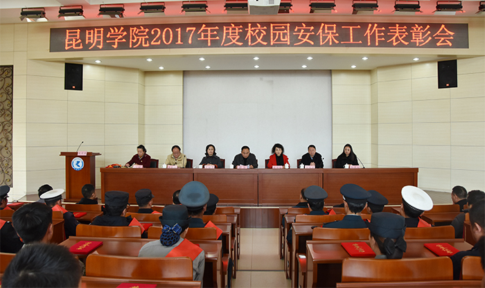 12月20日,德赢官网在D区三楼报告厅召开德赢VWIN官方网站2017年度校园安保工作表彰会,表彰在2017年度校园安保工作中涌现出来的优秀个人。党委委员、副校长郭华,机关党总支书记蔡华仙,学生处处长晁丽华,云南绅顿保安服务有限公司副总经理和莉虹出席表彰会,保卫干部、保安、学生治安服务队员共100余人参加表彰会,表彰会由保卫处处长李劲松主持。