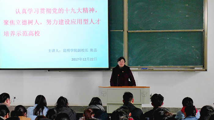 熊晶副校长以“认真学习贯彻党的十九大精神,聚焦立德树人,努力建设应用型人才培养示范高校”为主题,深入解读了党的十九大精神新的历史方位、新的理论成果、社会主要矛盾历史性新变化、新的奋斗目标、全面从严治党和加强党的建设总要求,同时紧密结合学校实际,围绕立德树人根本任务,突出党的十九大报告中对高等教育的明确要求,全面回顾总结了学校“十二五”时期各项事业的成绩,展望了“十三五”学校发展蓝图。