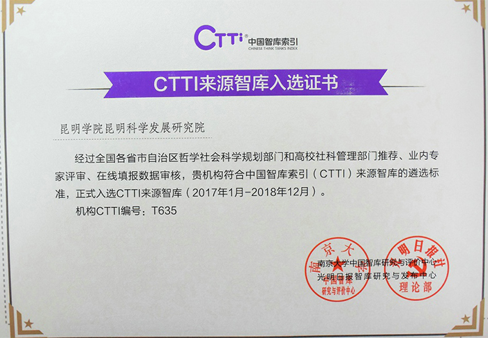经相关单位推荐、CTTI系统填报、专家团评审等程序,昆明科学发展研究院从3000多家研究机构中脱颖而出,正式成为CTTI来源智库新增补的100余家高校智库之一,也是云南省唯一入选CTTI来源智库的地方本科高校智库。 12月20日,南京大学、光明日报社共同举办的“2017中国智库治理暨思想理论传播高峰论坛”在京举行。昆明科学发展研究院吴瑛院长、沈艳萍副院长应邀参加论坛,并领取了入选证书。昆明科学发展研究院正式成为CTTI来源智库,标志着德赢VWIN官方网站智库建设又上了一个台阶,智库服务地方经济社会的能力正在不断提高,同时也是云南省推进省院省校合作,德赢VWIN官方网站与南京大学共同合作取得的成果之一。