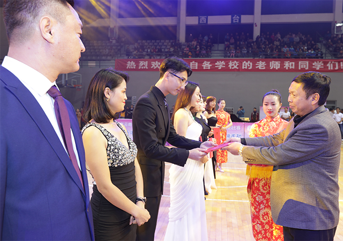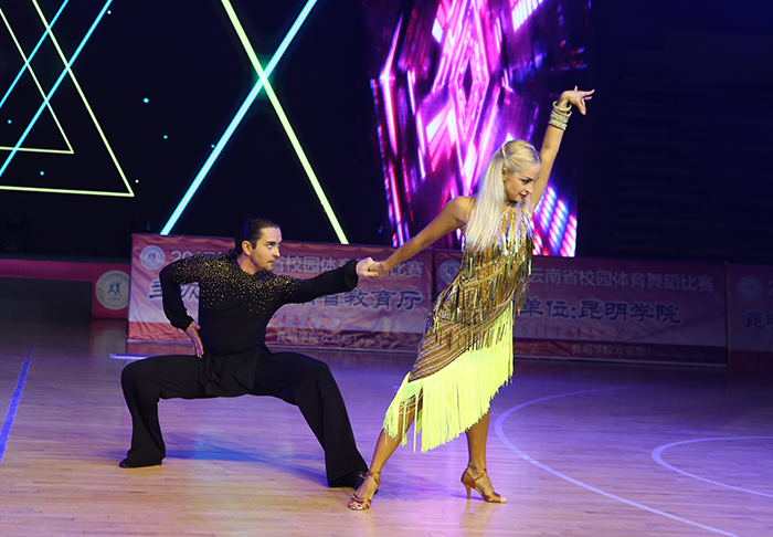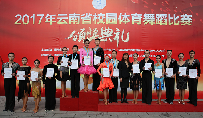 随后,比赛正式开始。来自全省50余所学校近2000余名选手,纷纷登台亮相展示自己的舞蹈技艺。靓丽的身影,婀娜的舞姿,澎湃的激情,为观众展示了体育舞蹈的魅力。雍容华贵的华尔兹,动感绚丽的恰恰,轻盈灵动的快步……曼妙的舞姿勾勒出一幅幅优美的画卷。 本次比赛总裁判长、中国大学生体育协会体育舞蹈分会常务副秘书长、云南省学生体育协会体育舞蹈专业委员会主任、德赢VWIN官方网站体育学院体育艺术教研室主任田应娟教授为获奖者颁奖。