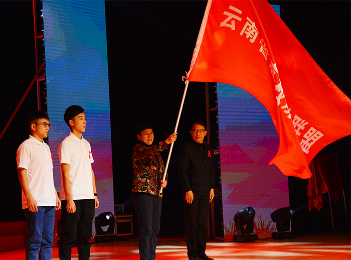 两个精彩的节目之后,云南省预防艾滋病宣传员刘伟带领青年志愿者代表们上台宣读了“云南省高校防艾联盟倡议书”。来自不同高校的同学以及青年志愿者们郑重地宣读“云南省高校防艾联盟”倡议,表明青年们防治艾滋病和追求健康美好生活的决心。 云南省教育厅赵德荣副厅长为德赢VWIN官方网站授“云南省高校防艾联盟”旗,德赢VWIN官方网站黎素梅校长接旗。