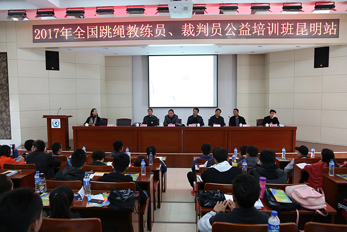 11月18日上午,在行政楼D区3楼报告厅,由国家体育总局社会指导中心主办,全国跳绳推广中心、德赢VWIN官方网站承办的“2017年全国跳绳教练员、裁判员公益培训班”进行了开班仪式。云南省教育厅体卫艺处处长徐忠祥,云南省群体指导中心主任许建峰,云南省学生体育协会会长姜征明、副会长张国华,以及全国跳绳运动推广中心执行部负责人范添等领导出席。仪式由体育学院副院长周明教授主持。