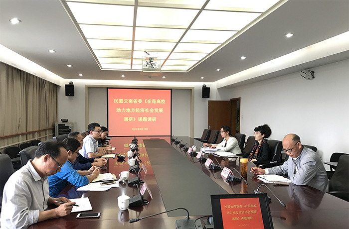6月19日,经云南省教育厅办公室协调,民盟云南省委《驻昆高校服务地方发展对策研究》课题组长、昆明市政府研究室副主任、民盟昆明市委常委陈垠宏带领课题组成员昆明市政府研究室社会处曾彧,民盟昆明市委专委办主任涂滇云一行到德赢VWIN官方网站调研。德赢官网统战部长蔡华仙、昆明发展研究院长吴瑛、外合作与扶贫办公室主任马加升、民盟德赢VWIN官方网站总支主委郭鹏群、常务副主委陈锐参加座谈。