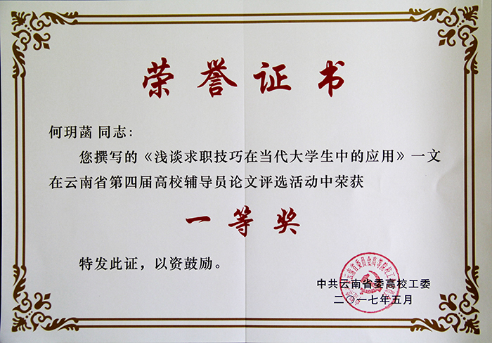 云南省第四届全国高校辅导员工作优秀论文评选,德赢官网推荐报送的四篇参评论文有两篇分获一、二等奖,其中美艺学院辅导员何玥菡老师的论文《浅谈求职技巧在当代大学生中的应用》获一等奖,旅游学院辅导员金刚老师的论文《浅谈高校辅导员的工作担当与责任》获二等奖。