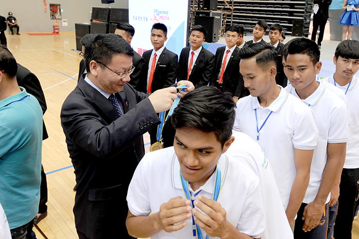 会上,出席闭幕式的领导、澜湄5国驻昆明总领馆官员为取得好成绩的各国大学生运动员代表颁奖。