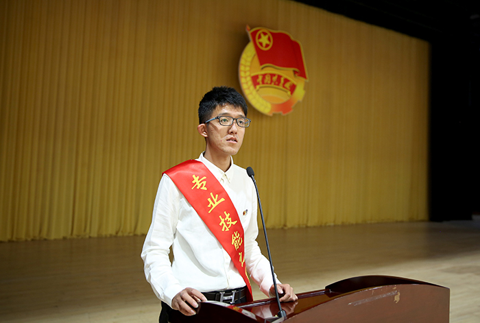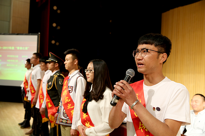 团员代表、专业技能之星王嘉曦同学发言。从专业学习、社会实践、创业创新等方面,分享了自己的学习成长经历。讲述了他在校期间美术作品获得国家级奖项8次、省级和校级奖项19次、留校收藏作品10幅,荣获了第十二届云南省大学生年度人物、连续三年获德赢VWIN官方网站三好学生、2015年获得中国美术学院社会美术水平考试山水8级证书、2017年获国家奖学金等12项荣誉称号。同时他在大一学年就举办美术作品联展,四年来坚持手绘德赢VWIN官方网站每一处风景的明信片,运用创新创业实践与同学共同开了淘宝店。他用自己的经历告诉我们要珍惜青春、努力学习、回报父母、奉献社会。