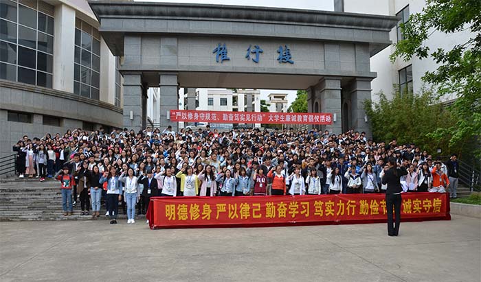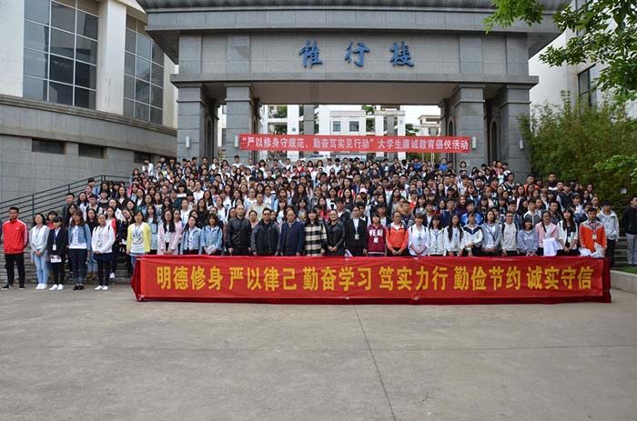 4月27日,由校纪委、校团委联合举办,大学生廉诚学社承办的“严以修身守规范 勤奋笃实见行动”大学生廉诚教育倡议活动在惟行楼举行。学校党委委员、纪委书记王映平,纪委副书记兼监察处长陈开祥,校团委书记魏妮娅,纪委办(监察处)全体同志和各教学院(系)学生党员代表、学生干部代表、入党积极分子培训班学员和大学生廉诚学社全体社员共500余人参加了本次活动。活动由大学生廉诚学社社长付靖同学主持。
