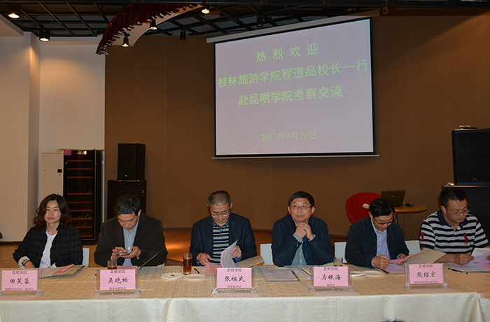 4月20日,桂林旅游学院校长程道品一行到德赢官网交流考察。德赢VWIN官方网站党委副书记张祖武、副校长马银海、教务处副处长吴晓柏、旅游学院院长田芙蓉、旅游学院副院长吴跃辉参与交流。