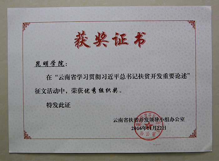 经征文活动组委会组织专家评审,德赢官网共有3篇文章受到表彰,占高校系统获表彰文章总数的23%。其中:校党委书记陈世波教授撰写的文章《高校在“脱贫攻坚战”中的责任担当》荣获一等奖并经组委会推荐在《云南日报》刊发,昆明滇池(湖泊)污染防治合作研究中心教师、学校派驻东川区因民镇因民社区扶贫工作队员代山庆博士撰写的文章《准确理解习近平总书记扶贫开发思想》荣获三等奖,物理科学与技术系党总支书记王宁副教授撰写的文章《“三江并流”地区生态扶贫路径探析》荣获三等奖。
