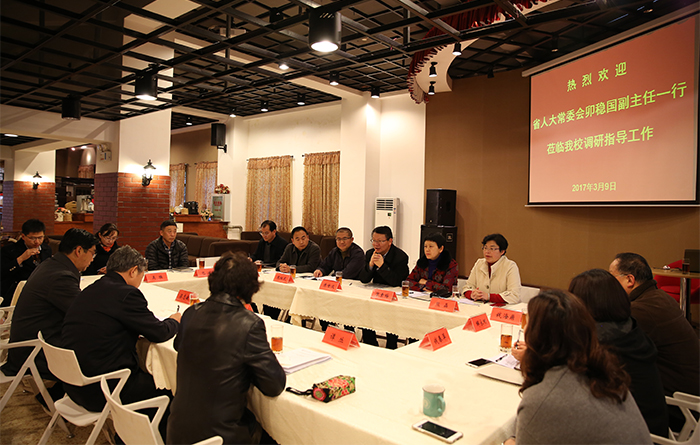 3月9日,省人大常委会副主任卯稳国率省人大常委会内务司法委员会主任梁志敏、法制工作委员会副主任(正厅级)谭丛到德赢官网调研指导工作,充分肯定德赢官网十二五期间取得的显著成绩,对德赢官网办学定位、学科建设、教育教学质量提升、学生综合能力培养、服务地方经济社会和校园建设等工作给予高度肯定和赞誉。学校党委书记陈世波,校长黎素梅参加调研并介绍学校人才培养、社会服务等办学情况。
