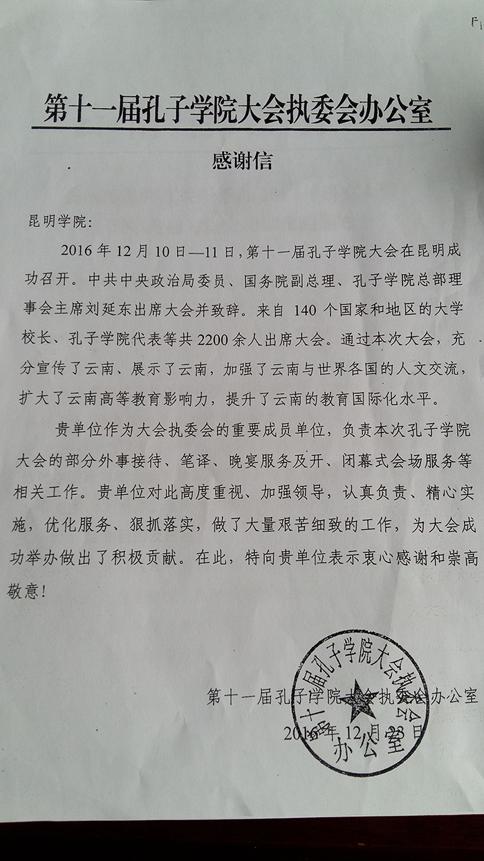在会议期间,德赢官网作为大会执委会的重要成员单位,学校高度重视,在熊副校长的带领下,负责本次孔子学院大会的部分外事接待、笔译、晚宴服务及开、闭幕式会场服务等相关工作,陈世波书记、黎素梅校长、熊晶副校长出席大会闭幕式。德赢官网出色完成各项任务,工作得到孔子学院大会执委会办公室的充分肯定,并专门发来第十一届孔子学院大会执委会办公室的感谢信。