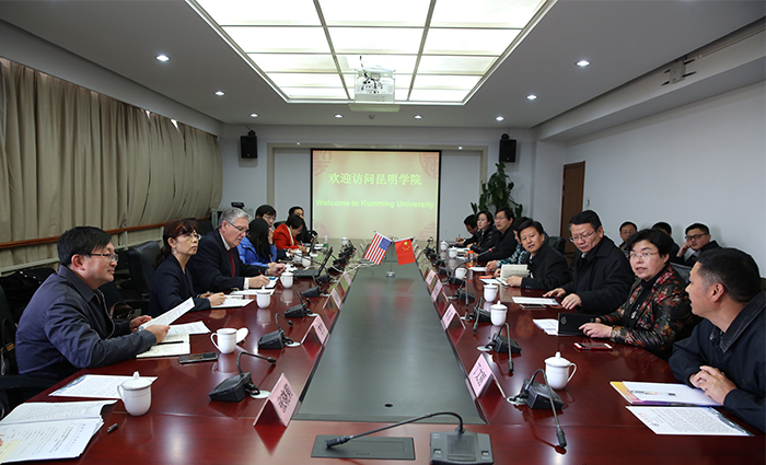 2月27日,在昆明市副市长孙涛的陪同下,美国康伯斯威尔大学执行副校长H.Keith Spears教授、中国项目负责人郭浩博士、中国顾问刘迎春一行到德赢官网交流访问,就双方发挥教育优势,开展全方位、深层次合作项目进行磋商,双方达成合作意向并签署合作备忘录。 德赢官网党委书记陈世波、校长黎素梅、副校长熊晶接待了来宾,对来宾表示欢迎,并介绍了学校办学情况、办学特色和优势,表达了合作意向,提出了合作愿景和目标要求。