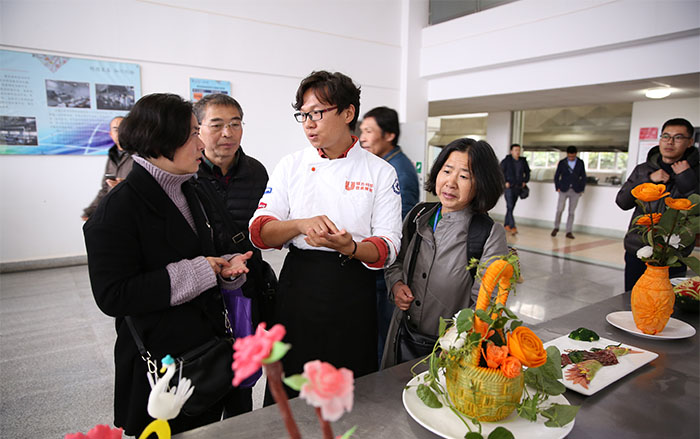 合作协议签字仪式后,来访代表一行在德赢官网旅游学院院长田芙蓉、党总支书记熊绍宏等负责人的陪同下参观了校园环境建设,深入旅游学院烹饪实训中心、旅游酒水实验室等教学场所进行参观考察,与正在实训的学生进行热切交流,对学生实训作品进行评阅,并在作品前驻足留影。德赢官网一流的教学设施、特色的餐饮教学赢得代表们赞不绝口,给予一致好评和高度赞誉。