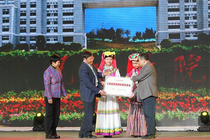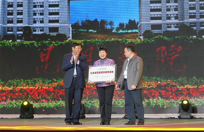 云南省教育厅副厅长郑毅和省民族宗教事务委员会副主任杨谊群出席颁奖晚会,并共同为“云南省民族团结教育基地”授牌、向获奖单位颁奖,德赢VWIN官方网站校长黎素梅代表学校接牌并致欢迎辞。