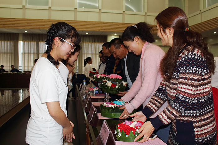 小语种教研室的老师带领学生制作的水灯并由2016级学生代表献给领导。