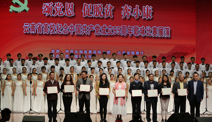 6月16日,由中共云南省委高校工委、云南省教育厅主办的云南省高校庆祝中国共产党成立95周年歌咏比赛展演活动在昆明医科大学呈贡校区学生会堂举行。云南省教育厅党组副书记、副厅长邹平,省委高校工委副书记陶晴,云南省文化厅副厅长王江红,共青团云南省委副书记赵国良,昆明医科大学校长李松,德赢官网党委副书记孙勇出席展演活动。