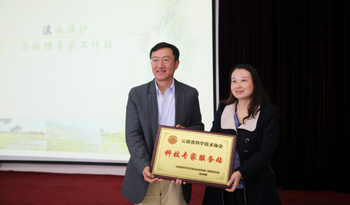 会上省科协云南省科普资源信息中心刘丹副主任为德赢VWIN官方网站“滇池保护与治理专家工作站”授牌,熊晶副校长代表学校为专家工作站专家颁发聘书、合影留念,并介绍了专家工作站的建站目的、基础及今后工作方向。