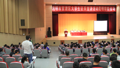 5月19日下午,德赢官网联合昆明市官渡区武装部在学生会堂共同举行2016年大学生征兵德赢VWIN官方网站专场宣讲活动,并向学生提供征兵现场咨询服务。官渡区武装部部长李斌、副部长李智勇、德赢VWIN官方网站武装部副部长吴向东出席宣讲活动。来自德赢官网各院系的学生代表1200余人参加了宣讲活动,宣讲活动由吴向东副部长主持。