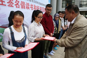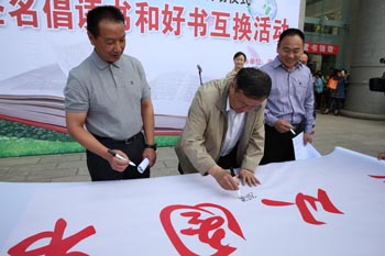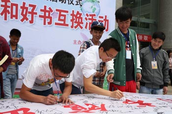 接着,与会校领导在印有“阅读,请到图书馆”的横幅上签字,图书馆馆长李海雁、学生处处长晁丽华、校团委书记魏妮娅、图书馆副馆长段芸以及在场的师生也纷纷写下自己喜爱的书名、读书格言、祝福的话语或签下自己的姓名,表达对读书的兴趣和热爱,由此拉开整个读书日系列活动的序幕。此外,图书互换、闲置书免费领取活动将持续进行。