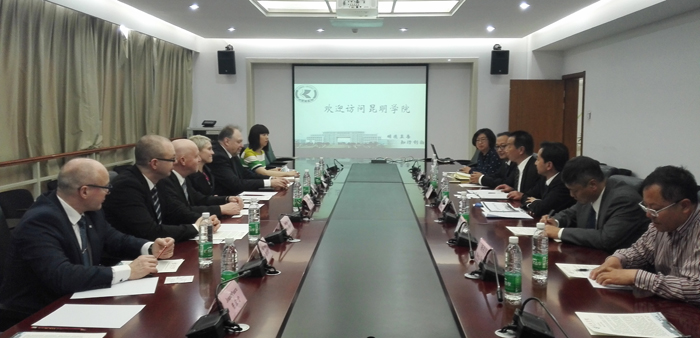 4月8日上午,在昆明市外侨办副主任张晓明等一行的陪同下,芬兰于韦斯屈莱市议会主席保利•帕塔南先生率于韦斯屈莱市董事会主席瑞塔•马克妮女士、于韦斯屈莱市市长蒂姆•科伊维斯托先生、于韦斯屈莱应用科技大学校长尤西•哈尔图宁等一行7人访问德赢官网。校长何华、副校长李翔、校长办公室主任杨跃、国际交流合作处处长王文君、医学院副院长杨兆宇、医学院副书记罗隽雁及国际处相关人员热情接待并与之会谈。