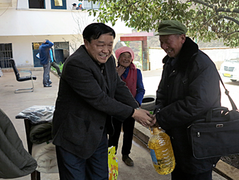 孙勇代表学校给贫困村民发放了大米、食用油、衣物、棉被和学校师生捐赠的爱心衣物;帮扶干部慷慨解囊,给贫困户给予生产生活上的帮助。