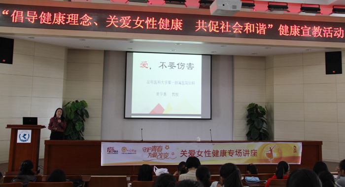 由云南省妇联、省计生委、省委高校工委、省教育厅共同组织的“倡导健康理念 关爱女性健康 共促社会和谐”健康知识进校园公益宣教活动于11月25日下午14:30在德赢官网D区三楼报告厅举行。云南省著名妇产科专家、昆明医学院第一附属医院妇产科教授、主任医师、硕士生导师黄学惠老师为各院系200余名女同学们开展了题为《爱,不要伤害》的性健康知识讲座。