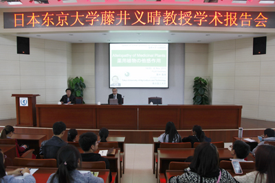 藤井教授长期从事药用植物化感作用的研究,在国际上提出和建立了植物化感物质功能鉴定的方法,分离了大量可用于药物开发的植物他感物质成分并于2014年获得国际莫里斯奖。藤井教授首先介绍了他及其科研团队在植物他感领域的研究成果和研究进展。而后简述了植物化感物质对其它植物的阻害和促进作用及在农业上应用并着重介绍了植物他感作用的检测方法。随后,藤井教授的研究生(中国留学生)曾英子简要介绍了其“中国云南少数民族药用植物的利用与现状”的研究成果,目前已在黄莲属植物中分离到具有药用价值的化感物质。在提问交流环节,部分参会师生提出了自己所感兴趣的问题,与藤井教授进行了积极的交流。