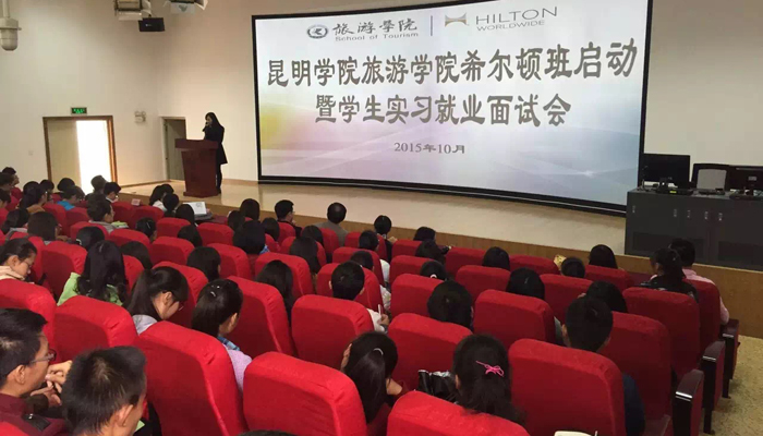 出席本次开班仪式暨就业启动会的有希尔顿酒店管理集团大中华区招聘负责人Will秦及旗下8家酒店:抚仙湖希尔顿酒店、西双版纳万达希尔顿逸林度假酒店、大理实力希尔顿酒店、深圳蛇口希尔顿南海酒店、厦门希尔顿逸林酒店、无锡灵山元一希尔顿逸林酒店、常州新城希尔顿酒店的人力资源部总监或人力资源部经理,旅游学院院长田芙蓉、副院长吴跃辉、副书记杨光明、酒店管理教研室专业骨干教师,2014级、2015级酒店管理1、2班,2014级烹饪与营养教育1、2、3班260多名同学及教师参加。开班仪式由酒店教研室主任马英老师主持。