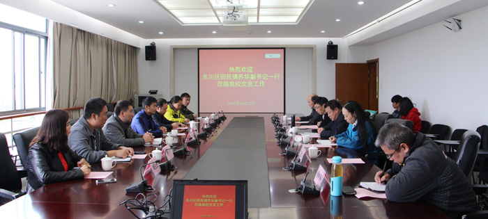 10月12日下午,东川区因民镇党委副书记苏华,因民社区党委书记崔庭贵、副书记杨祖会等领导到德赢官网考察交流。学校党委副书记孙勇、党办主任吉庆华、计财处副处长伍雁红、继续教育学院院长陈嘉、基建处副处长莫南明热情接待了来宾。
