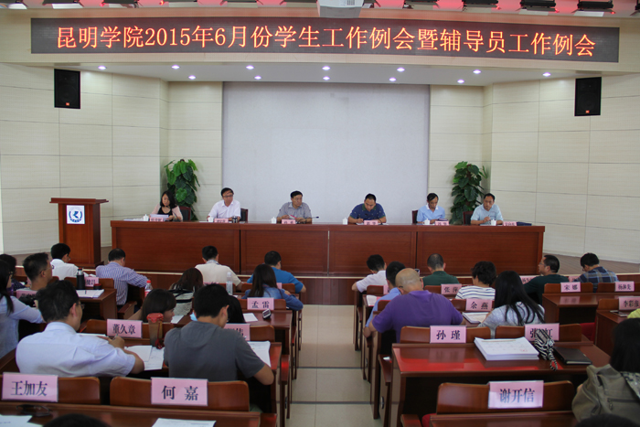 6月10日下午,学校在办公楼三楼报告厅召开2015年6月份学生工作例会暨辅导员工作例会。学校党委副书记孙勇、副校长郭华出席会议,学生处、武装部、后勤集团的领导,各院系党总支副书记、全体辅导员以及学生校长助理共120余人参加了工作例会。会议由郭华主持。