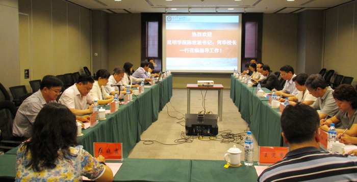 为学习交流昆明理工大学开展党建工作、“三严三实”和“忠诚干净担当”专题教育的情况,考察借鉴昆明理工大学在创新创业教育等方面工作的成功经验,商谈两校有关合作办学事宜, 5月14日下午,党委书记陈世波、校长何华及副校长熊晶、郭华、董建华率党办、组织部、校办、人事处、教务处、科研处等部门主要负责人,到昆明理工大学进行学习考察。昆明理工大学党委书记周荣、校长张英杰、副校长王华、校纪委书记李莉,校长助理、研究生院院长束洪春,以及党办、组织部、人事处、教务处、科技处、校办等部门主要负责人接待了德赢VWIN官方网站党政领导一行。