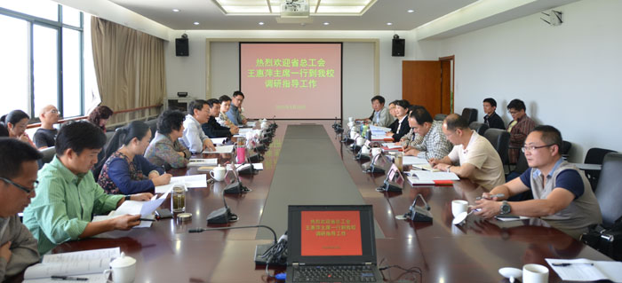 李媛芬副书记向调研组介绍了学校人员、机构设置、学科分类、科研成果等基本情况并重点介绍了学校实现跨越式发展所取得的成绩。孙晓坤常务副主席向调研组汇报了德赢VWIN官方网站工会工作,主要从学校党委加强对工会领导,大力支持工会工作以及学校工会组织建设、制度建设、工会工作机构、教代会制度、校务公开、维护职工合法权益、校园文化建设等方面的工作做了简要汇报。与会代表就调研组专题调研的内容进行了发言。