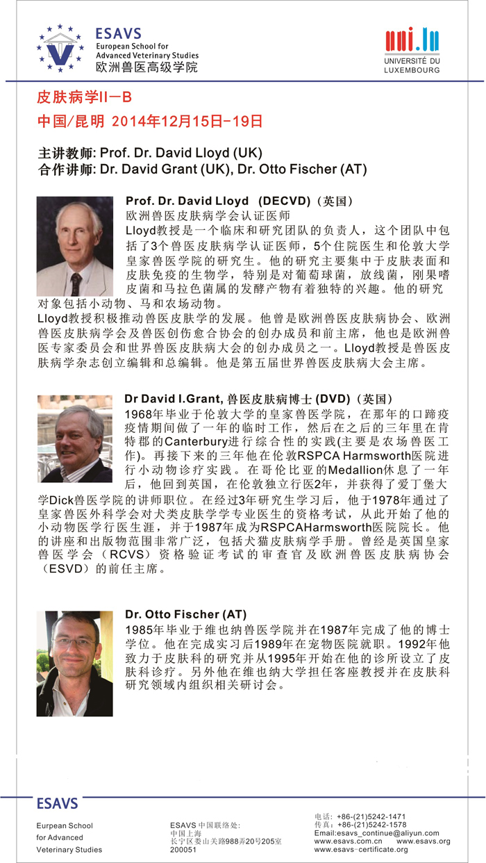 (ESAVS)第4期课程培训于12月15—19日期间开展,培训内容主要为皮肤病系列课程。该项目在中国从2005年开始,已经培训了超过1500人次的中国兽医,其开办的课程由具备国际一流水平的课程讲师和客座讲师主讲,提供最高效的学习效率,通过大量的病例演示,互动的教学模式,实践研讨班/实践操作和限制每次课程参加人数的方式达到最有效的知识和技能交流。